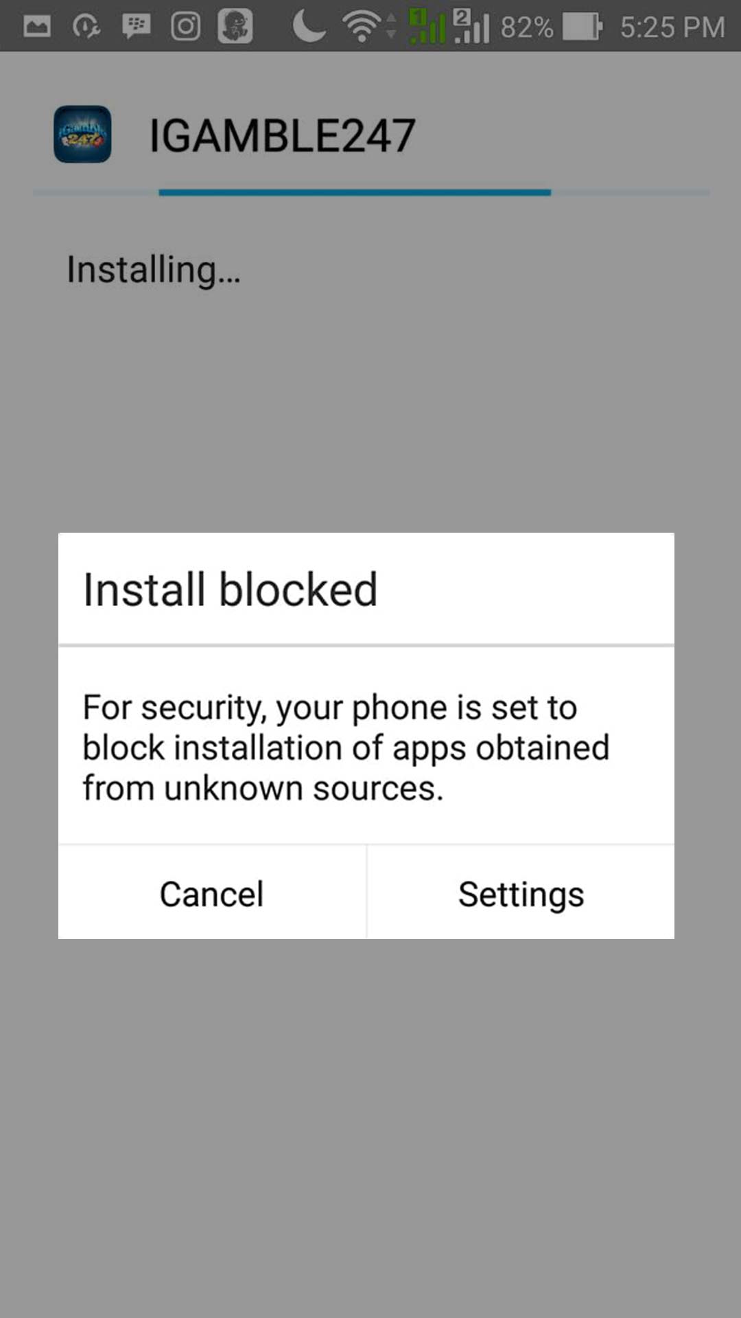 2. Jika sudah selesai, klik dan install langsung file Igamble247.apk, jika muncul keterangan Install Blocked, Pilih dan Klik “Settings”, setelah itu pilih “Unknown Source” di bagian “Security”, Centang/Klik pada bagian seperti yang dilingkari pada gambar dibawah ini.